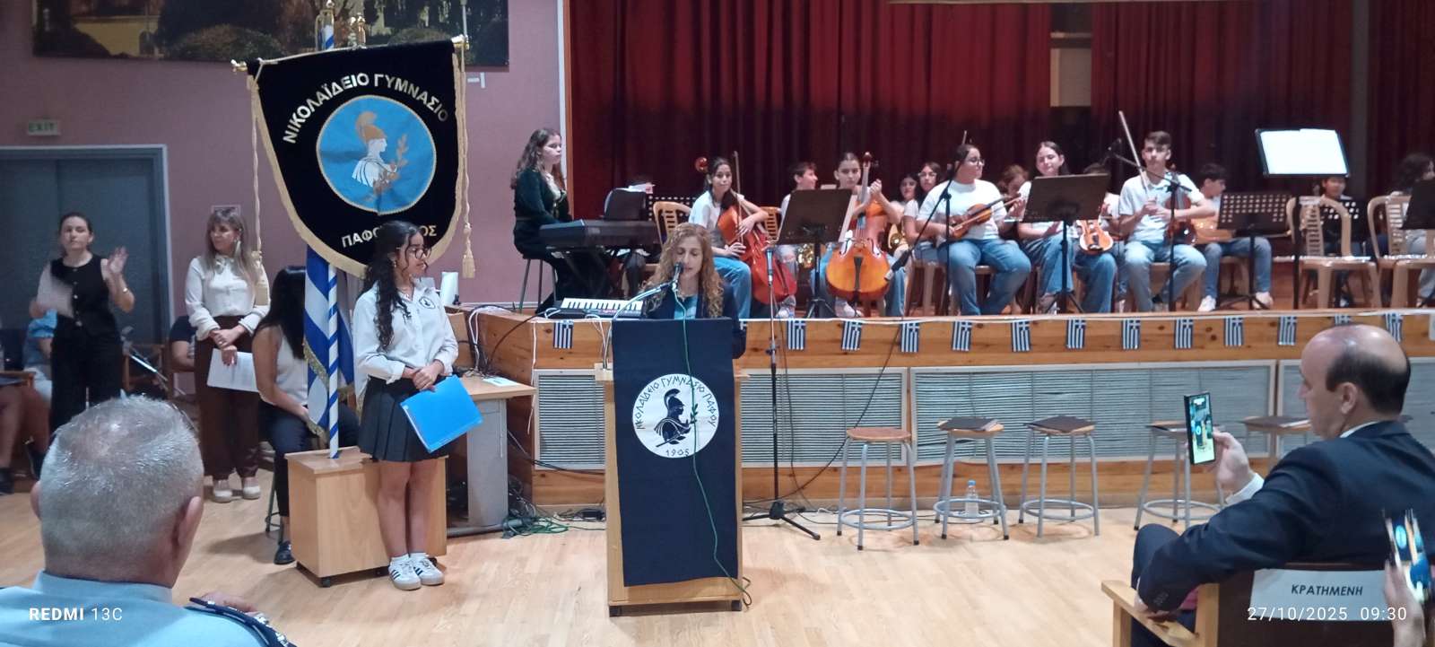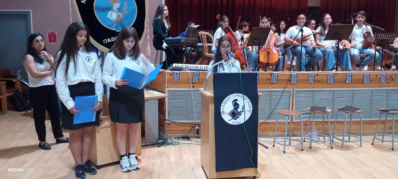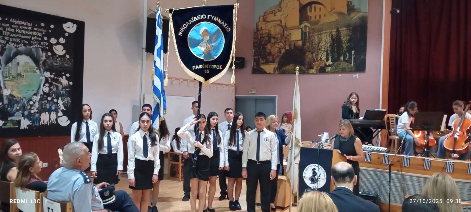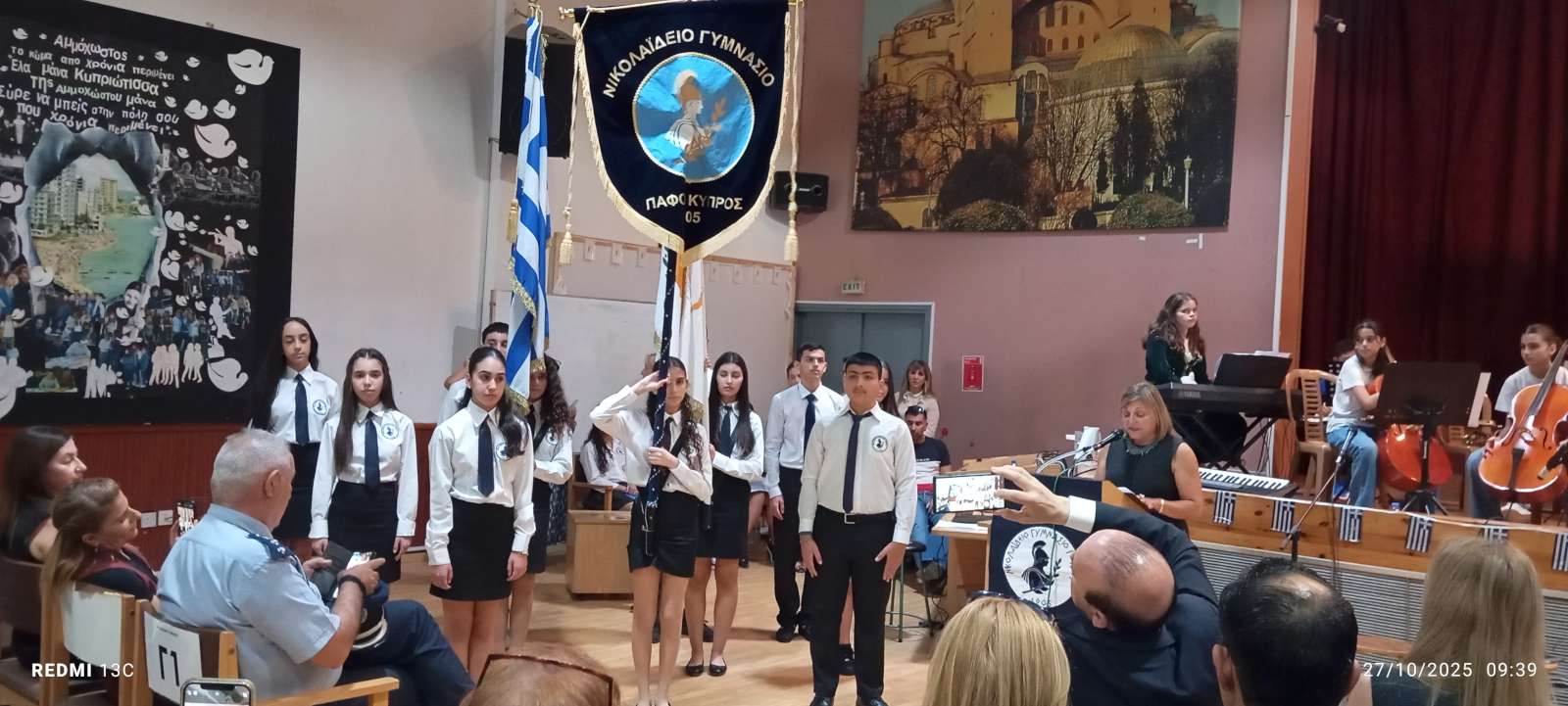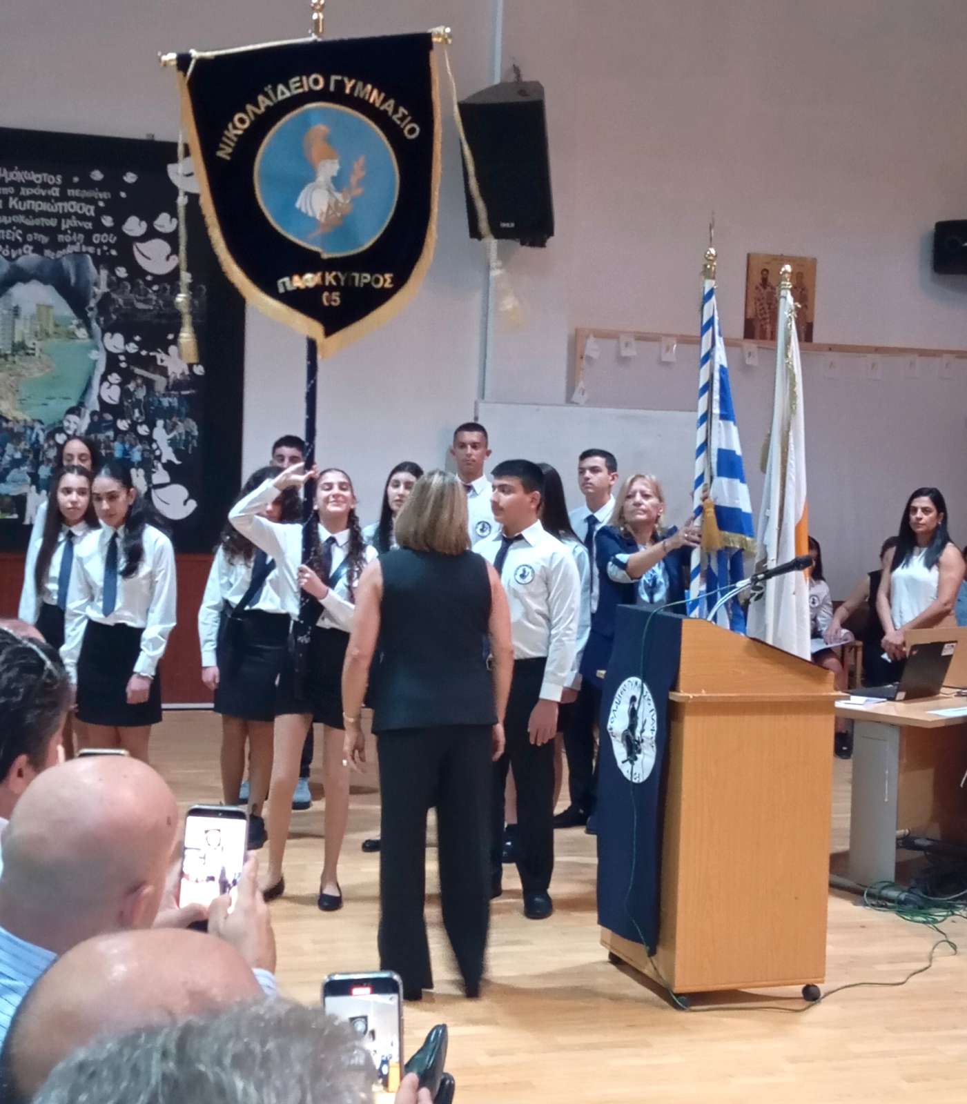 Στο πρώτο μέρος του προγράμματος έγινε η ανακήρυξη των Σημαιοφόρων και Παραστατών του σχολείου μας. Η Διευθύντρια του Νικολαΐδειου Γυμνασίου, κ. Ντανιέλλα Πιστέντη Μούγιαννου, παρέδωσε το Λάβαρο του σχολείου στη μαθήτρια Δημητριάδη Σωτηρία του Γ4, την Ελληνική Σημαία στην Κυριάκου Δανάη του Γ2 και την Κυπριακή Σημαία στη Δημητριάδη Ελευθερία του Γ5. Παραστάτες οι πιο κάτω μαθητές/τριες: Ιωάννου Μελιτίνη (Γ4), Κουππάρης Ξένιος (Γ4), Αθανασίου Σεμέλη (Γ4), Ευσταθοπούλου Μαρίνα (Γ4), Φαίδωνος Φλωρεντία (Γ2), Μουρατίδης Νικόλαος (Γ6), Σιελουβάρης Κωνσταντίνος (Γ5) και Στυλιανού Αντρέας (Γ5).