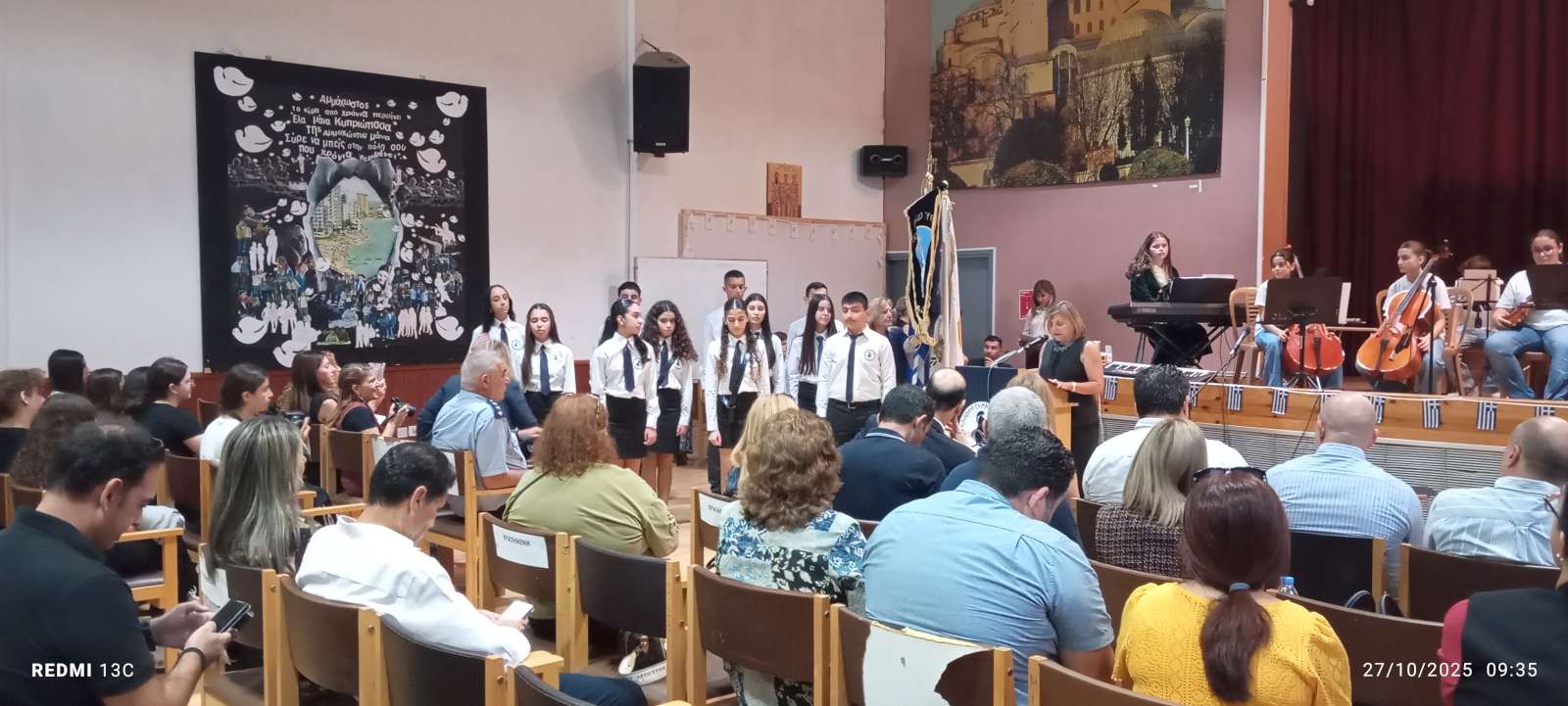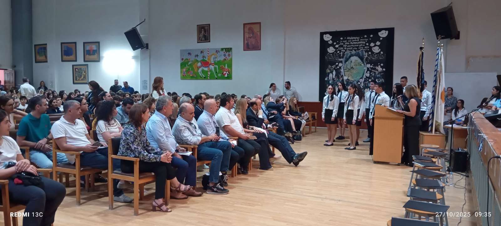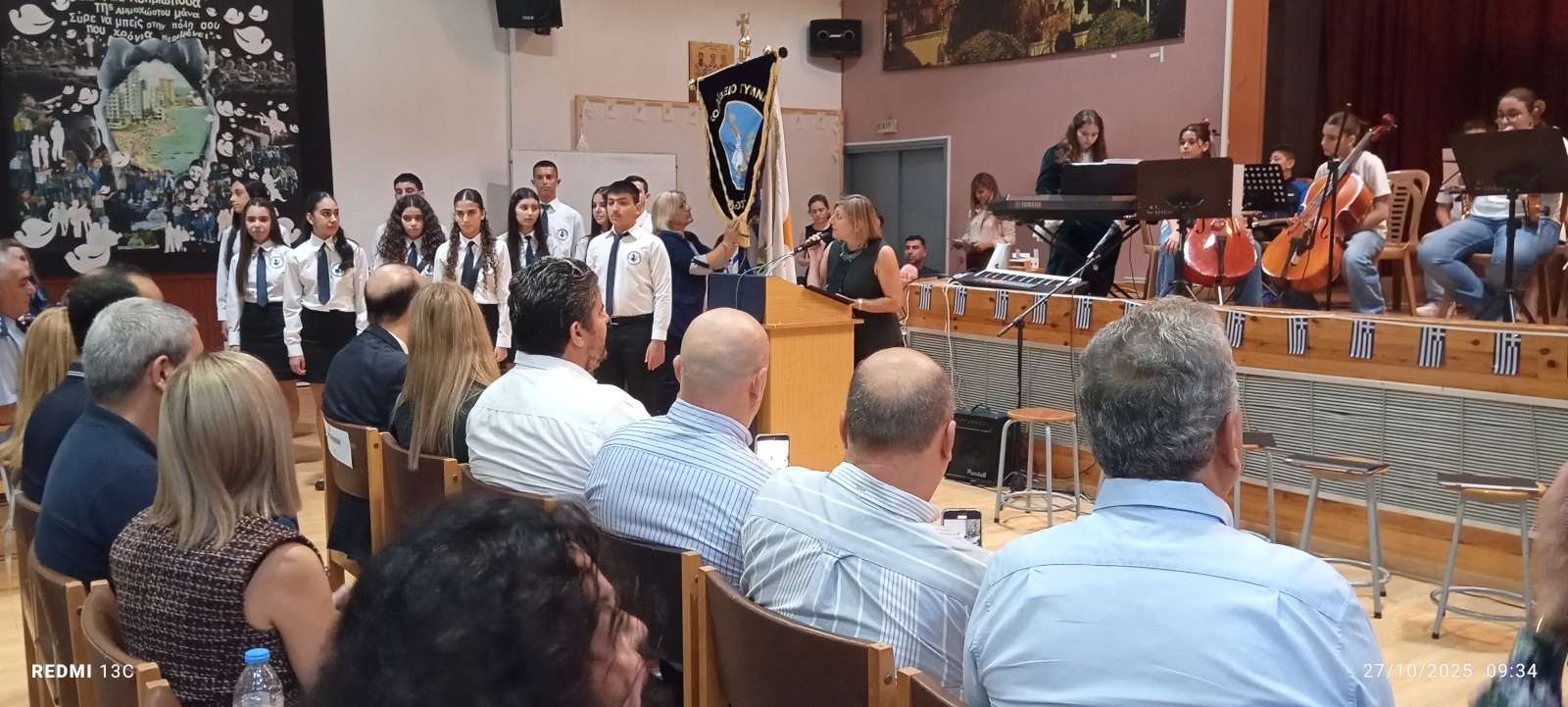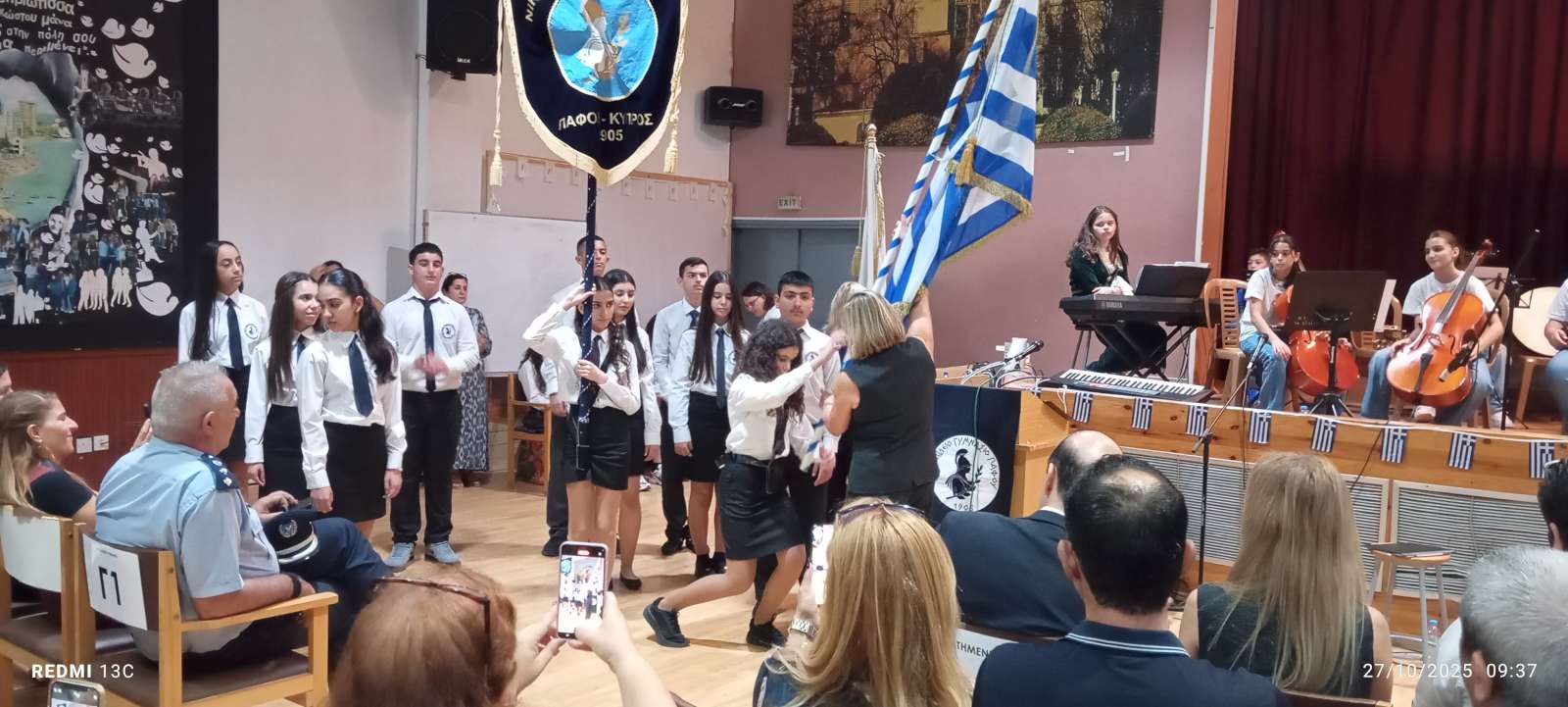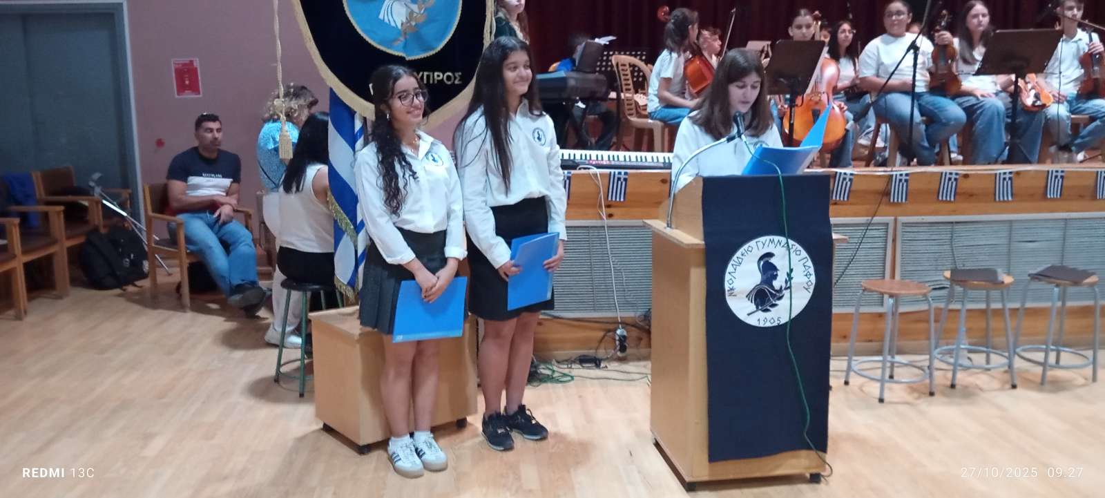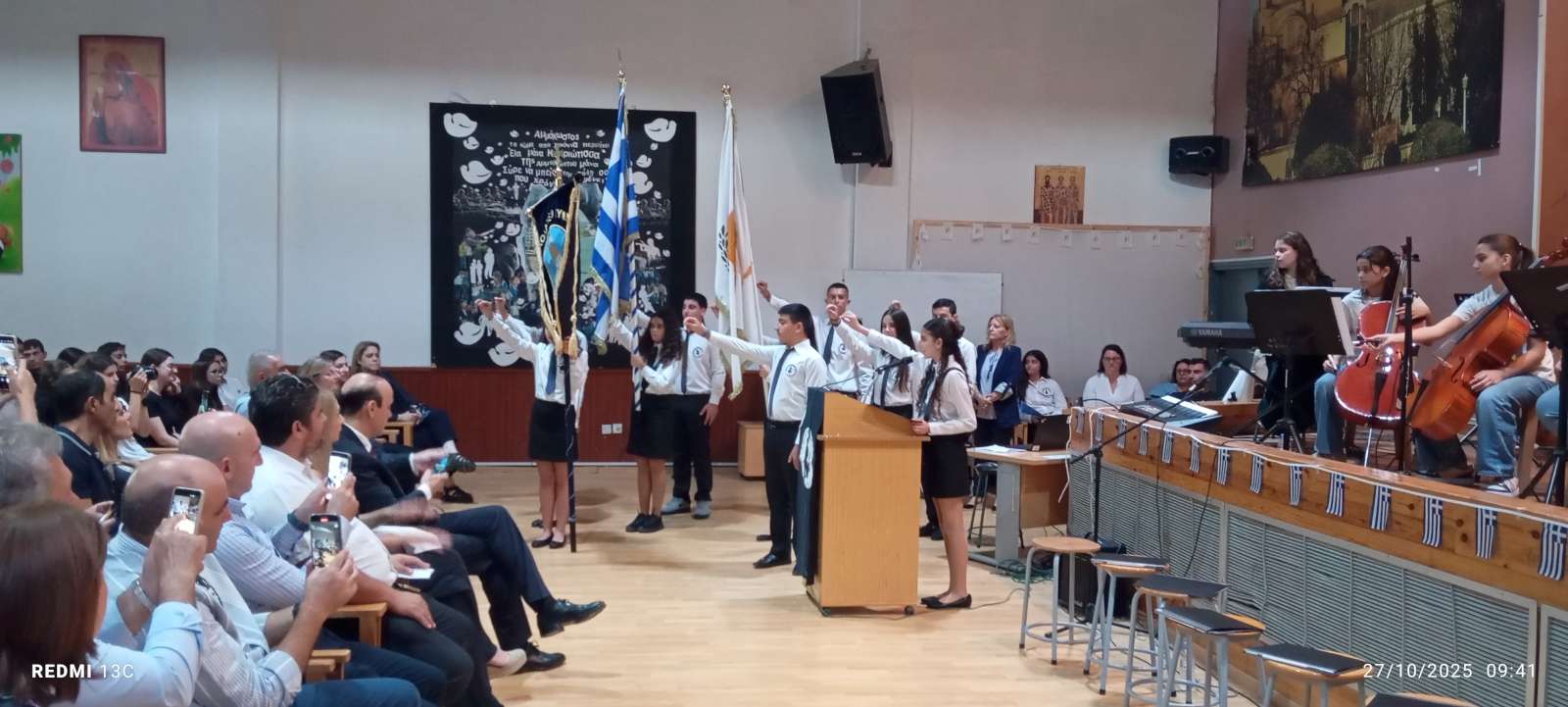 Στο πρώτο μέρος του προγράμματος έγινε η ανακήρυξη των Σημαιοφόρων και Παραστατών του σχολείου μας. Η Διευθύντρια του Νικολαΐδειου Γυμνασίου, κ. Ντανιέλλα Πιστέντη Μούγιαννου, παρέδωσε το Λάβαρο του σχολείου στη μαθήτρια Δημητριάδη Σωτηρία του Γ4, την Ελληνική Σημαία στην Κυριάκου Δανάη του Γ2 και την Κυπριακή Σημαία στη Δημητριάδη Ελευθερία του Γ5. Παραστάτες οι πιο κάτω μαθητές/τριες: Ιωάννου Μελιτίνη (Γ4), Κουππάρης Ξένιος (Γ4), Αθανασίου Σεμέλη (Γ4), Ευσταθοπούλου Μαρίνα (Γ4), Φαίδωνος Φλωρεντία (Γ2), Μουρατίδης Νικόλαος (Γ6), Σιελουβάρης Κωνσταντίνος (Γ5) και Στυλιανού Αντρέας (Γ5).