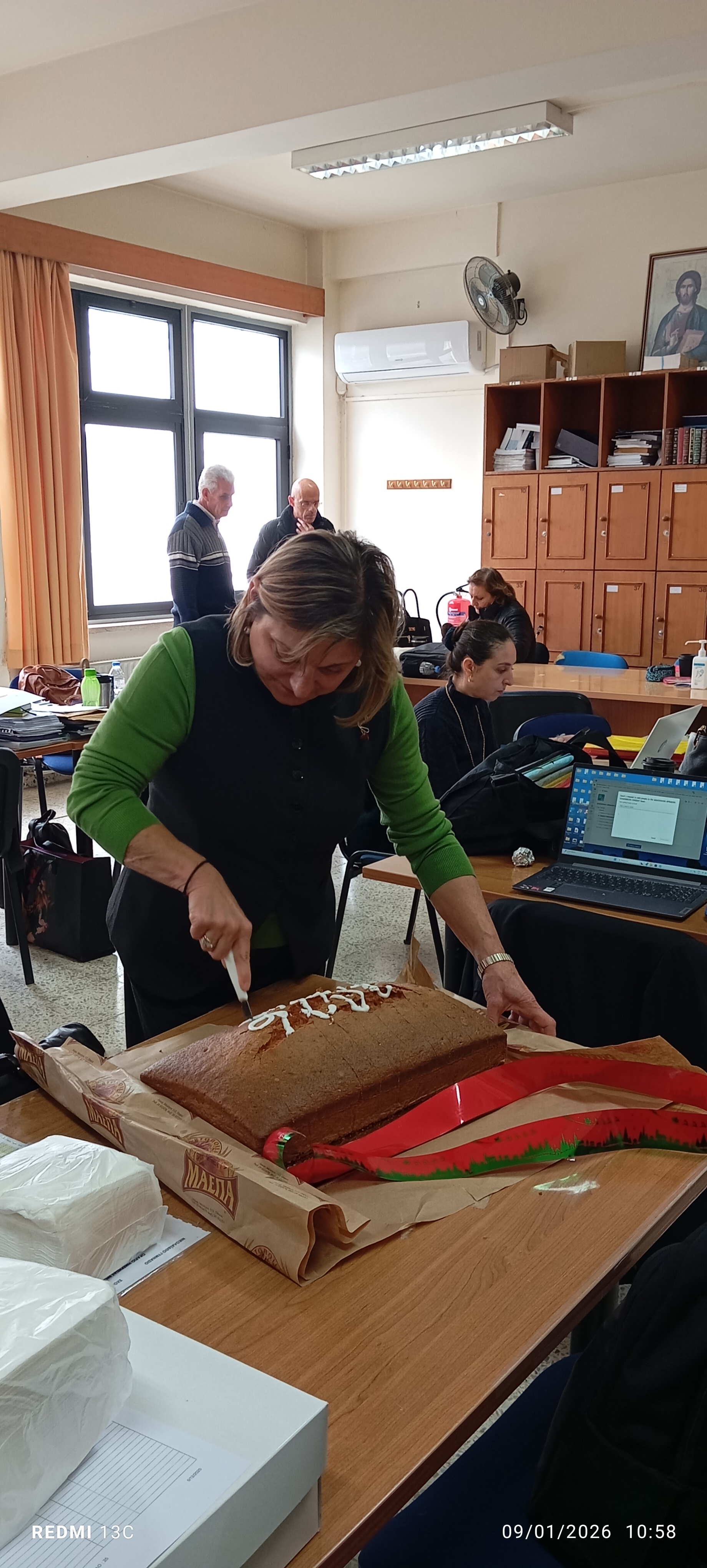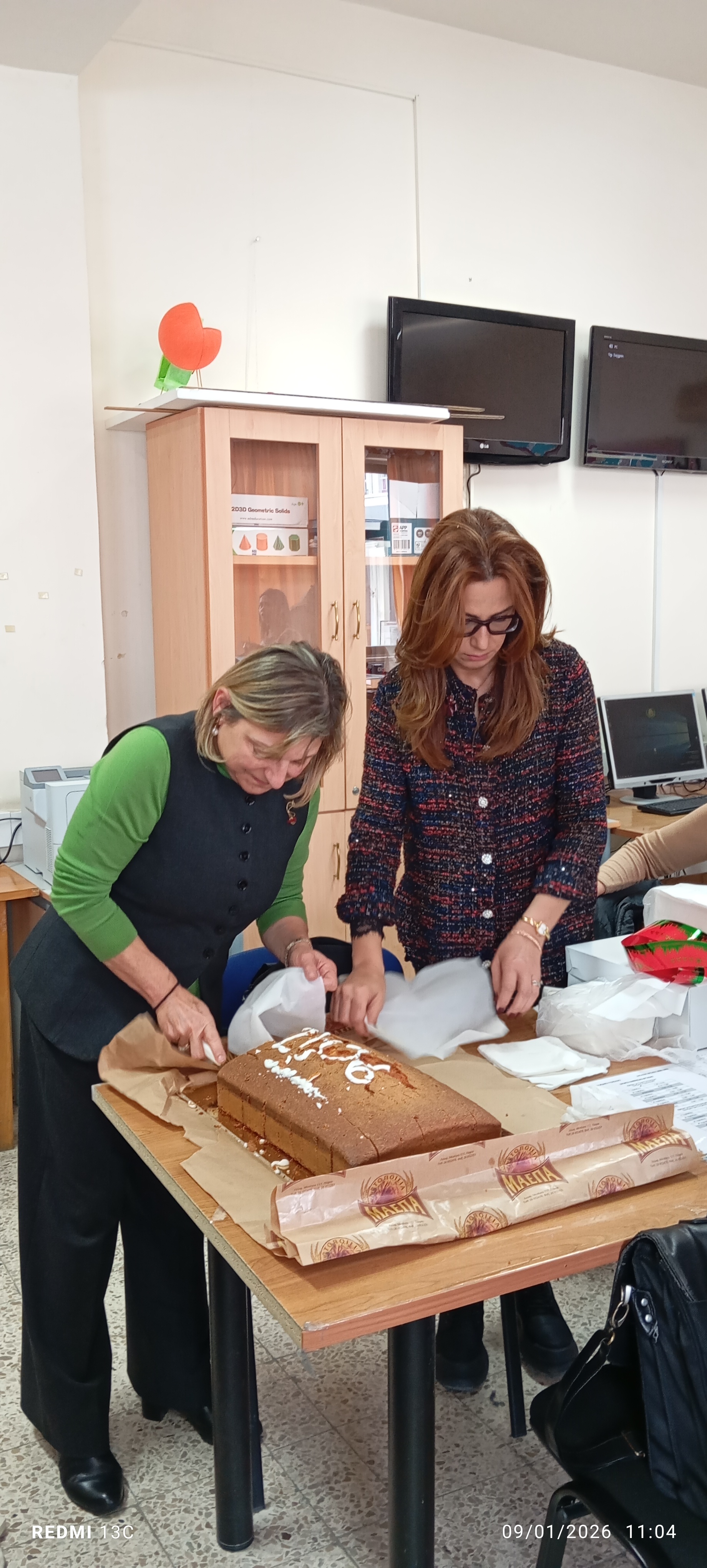 Η Διευθύντρια του σχολείου μας, κα Ντανιέλλα Πιστέντη Μούγιαννου, την Παρασκευή 9 Ιανουαρίου 2026, τίμησε το έθιμο της κοπής της βασιλόπιττας και ευχήθηκε σε όλους τους συναδέλφους «Χρόνια Πολλά και Καλή Χρονιά». Το έθιµο αυτό, που αναβιώνει κάθε χρόνο, µας θυµίζει τη λαογραφική και θρησκευτική ελληνική παράδοση. Συγκεκριµένα, ο Μέγας Βασίλειος θέλοντας να απαλλάξει την Καισάρεια της Καππαδοκίας - της οποίας ήταν Επίσκοπος - από επερχόµενο κατακτητή, ζήτησε από τους πλουσίους να δώσουν τα τιµαλφή τους, για να του τα παραδώσει. Όταν βέβαια ο κατακτητής αποµακρύνθηκε, ο Μ. Βασίλειος θέλησε να επιστρέψει όσα πήρε. Επειδή όµως, δεν ήξερε σε ποιον ανήκει και τι, έκρυψε το καθένα σε άρτο και τα µοίρασε σε αυτούς από τους οποίους τα είχε δανειστεί. Αυτός λοιπόν που βρίσκει το «χρυσό φλουρί» θεωρείται ο τυχερός / ευνοούµενος της νέας χρονιάς!