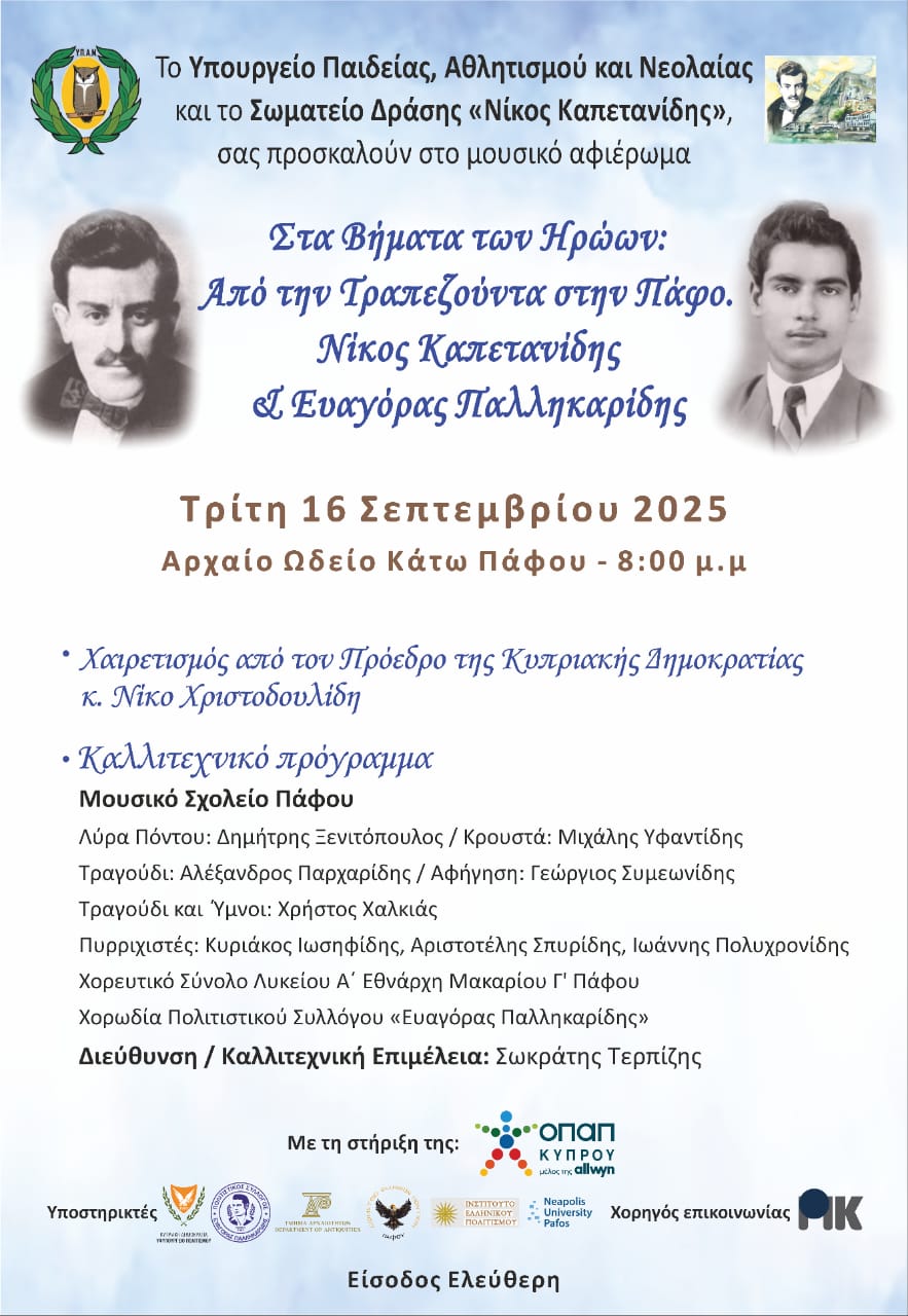 Οι μαθητές/τριες του Γ4 έλαβαν μέρος στο μουσικό αφιέρωμα που πραγματοποιήθηκε την Τρίτη 16 Σεπτεμβρίου 2025 στις 8:00 μ.μ. στο Αρχαίο Ωδείο Κάτω Πάφου με τίτλο: “Στα βήματα των Ηρώων. Από την Τραπεζούντα στην Πάφο. Νίκος Καπετανίδης και Ευαγόρας Παλληκαρίδης”.