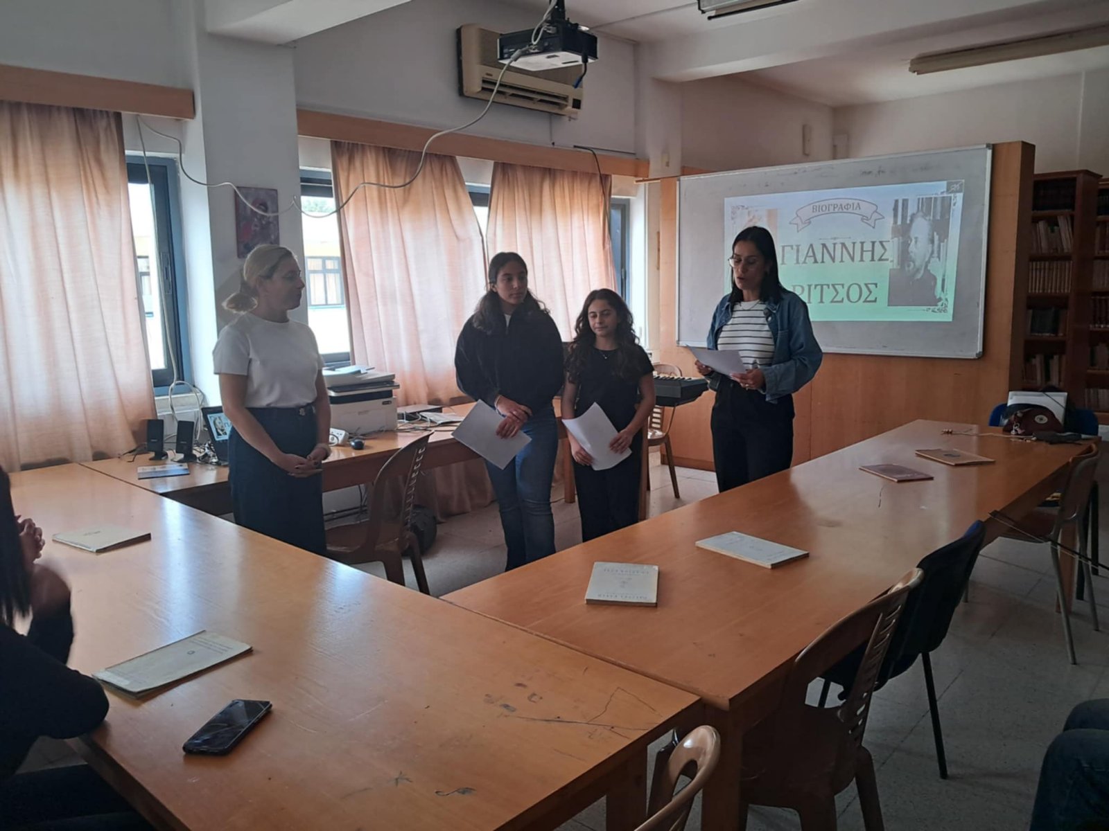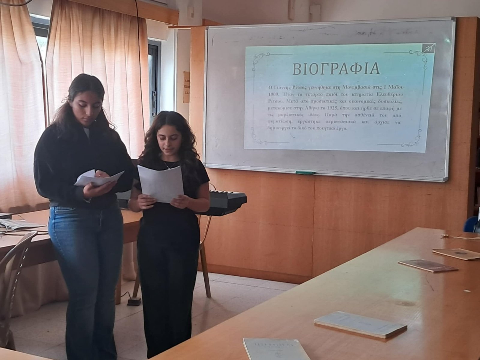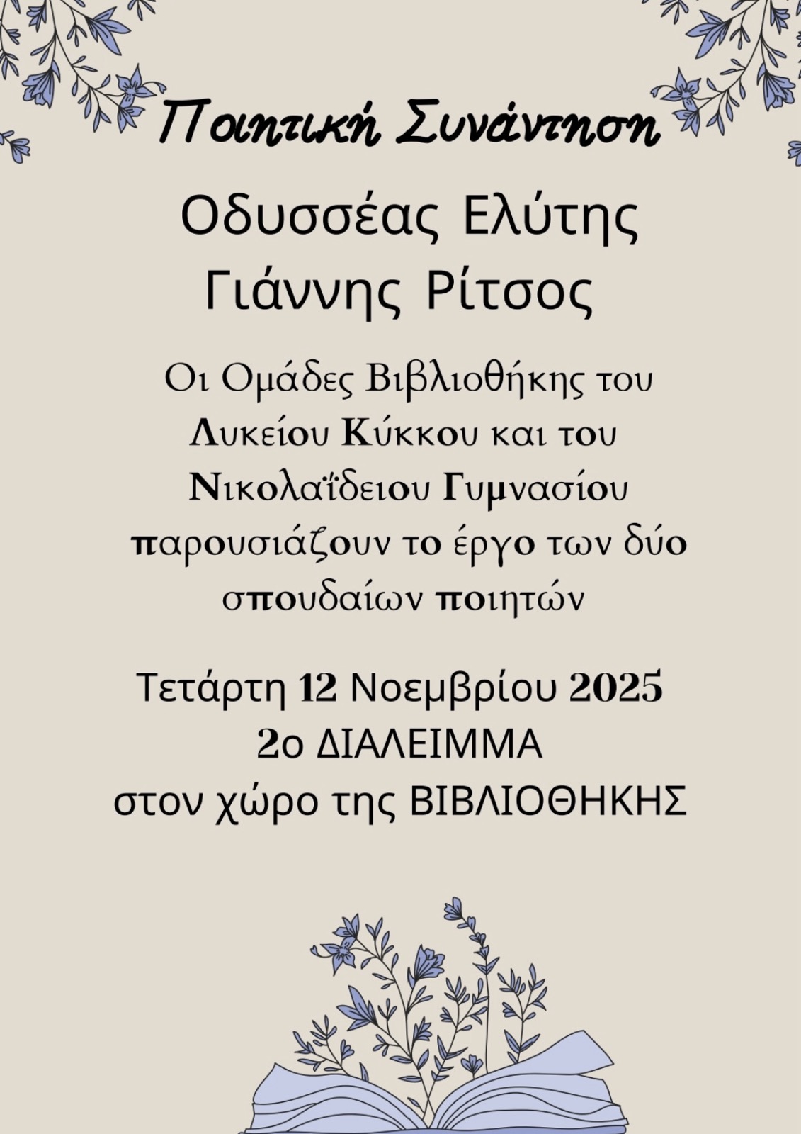 Την Τετάρτη 12 Νοεμβρίου, το 2ο διάλειμμα, η Επιτροπή Βιβλιοθήκης και Διά Βίου Μάθησης του Νικολαΐδειου Γυμνασίου και του Λυκείου Κύκκου, οργάνωσαν ποιητική συνάντηση στη βιβλιοθήκη, με αφιέρωμα στους ποιητές Οδυσσέα Ελύτη και Γιάννη Ρίτσο!